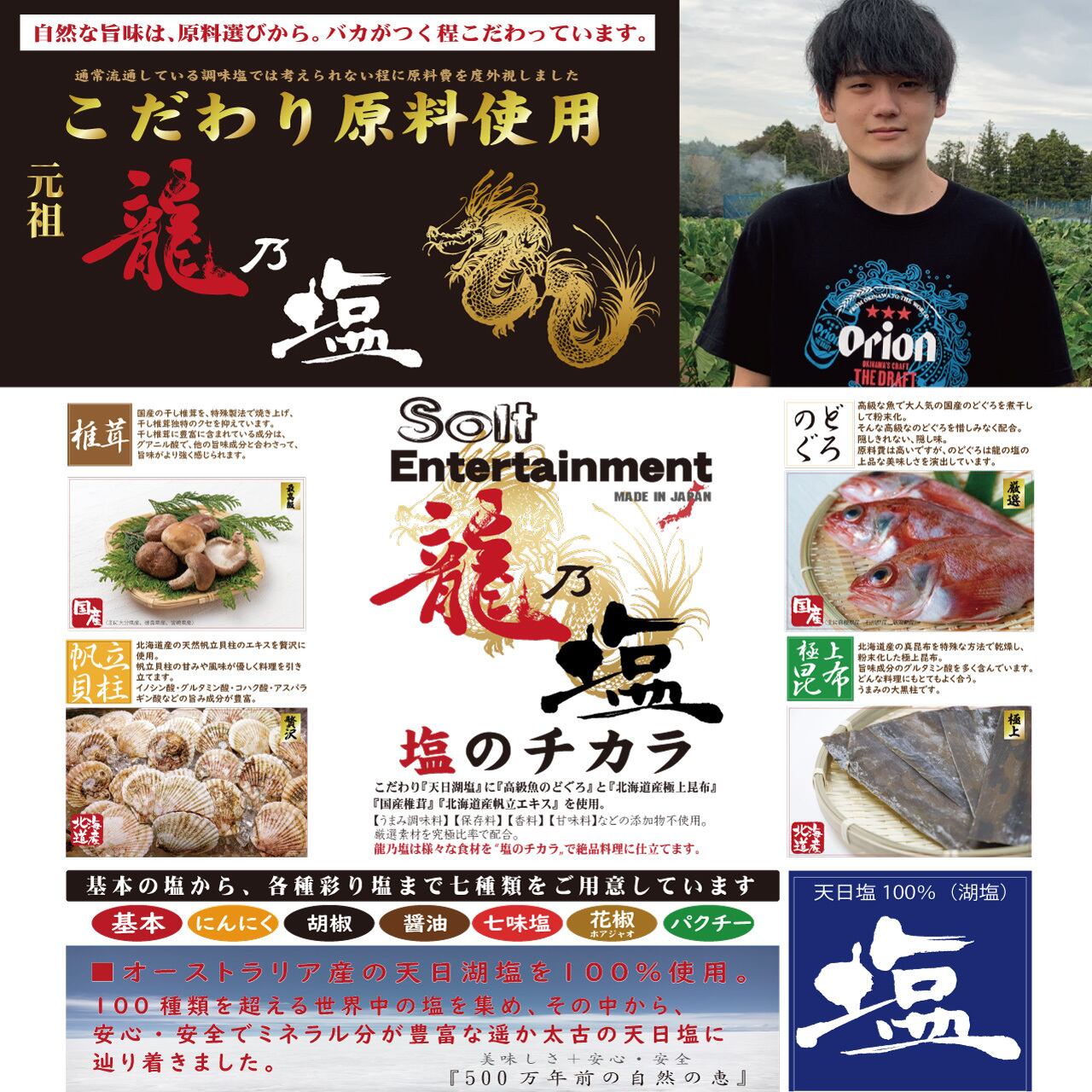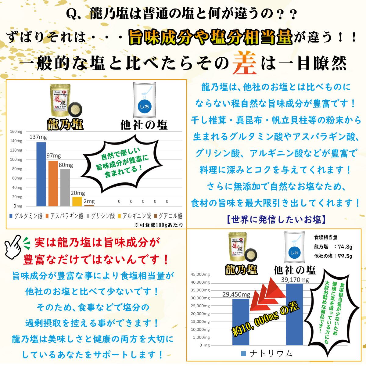 ✅10倍旨味の究極の塩、それが「龍乃塩」。バカがつくほど原料からこだわった完全オリジナルの調味塩です。旨味調味料を使用せず自然原料だけで、一般的な塩と比較して旨味10倍塩を開発。本当に美味しい塩を食べたい!方はぜひお買い求めください。【世界に発信したい塩】